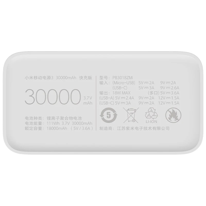 مشخصات فنی پاوربانک شیائومی مدل Mi PB3018ZM ظرفیت 30000 میلی آمپر ساعت